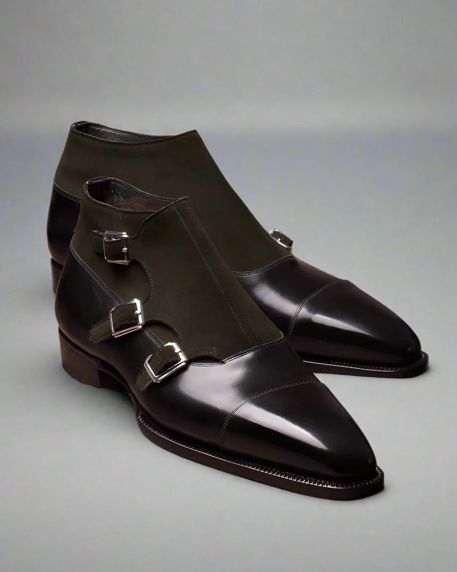 Men's Chocolate Brown Leather Suede Triple Monk Shoes